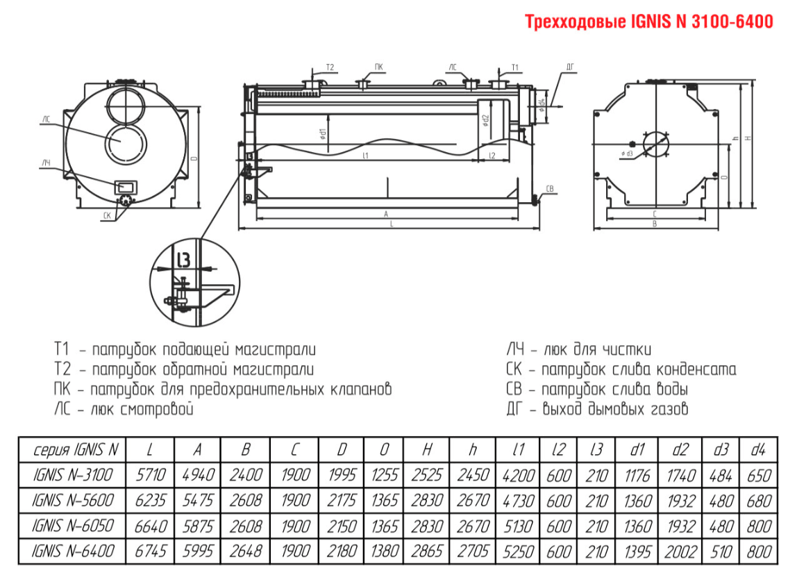 Технические характеристики водогрейного трёхходового котла для тепличных хозяйств ARCUS IGNIS N-6400